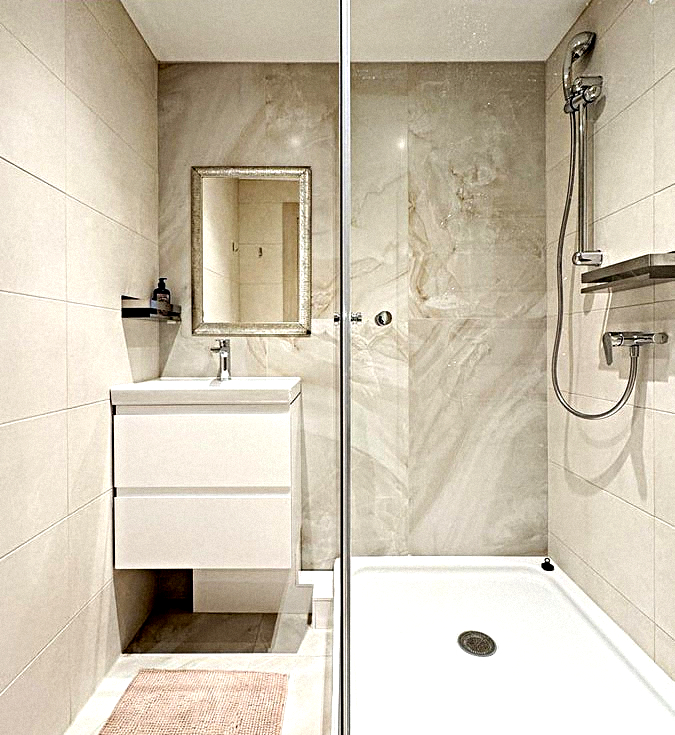 Shared bathroom: Equipped with a shower and a sink with a mirror.