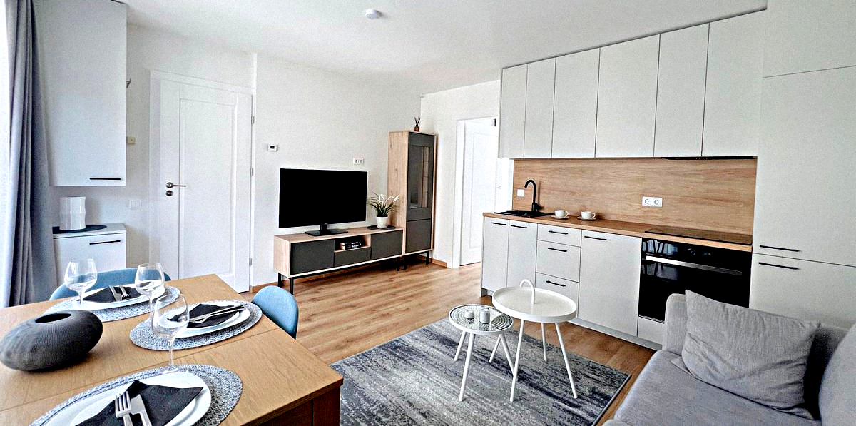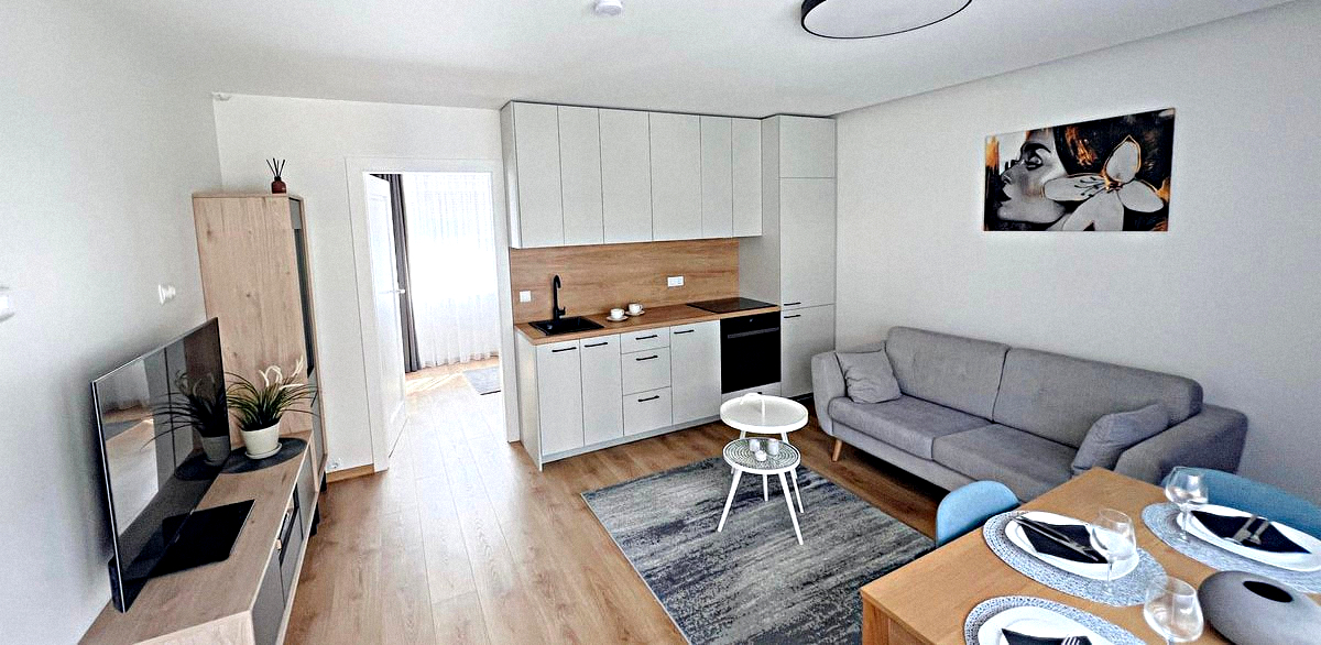 Living Room/Kitchen: A bright room with all necessary appliances, kitchen utensils, a dining table, a sofa, and a Smart TV.