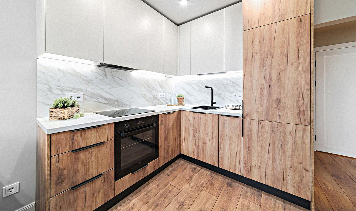 Kitchen: A spacious room with all necessary appliances, kitchen utensils, a dining table, and a sofa bed.