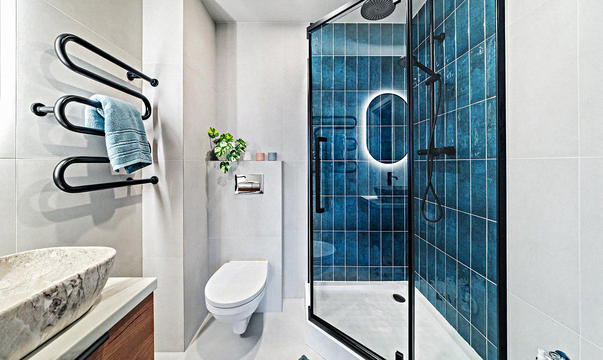 Bathroom: Equipped with a shower cabin, a sink with a mirror, and a toilet.