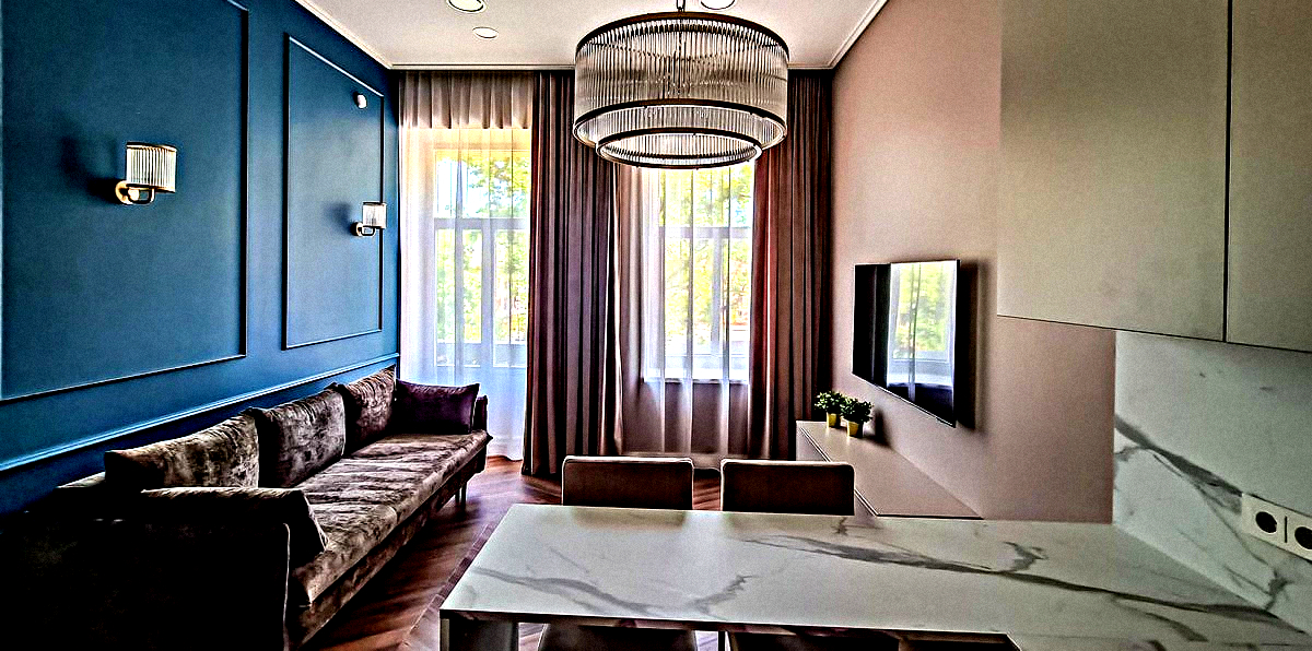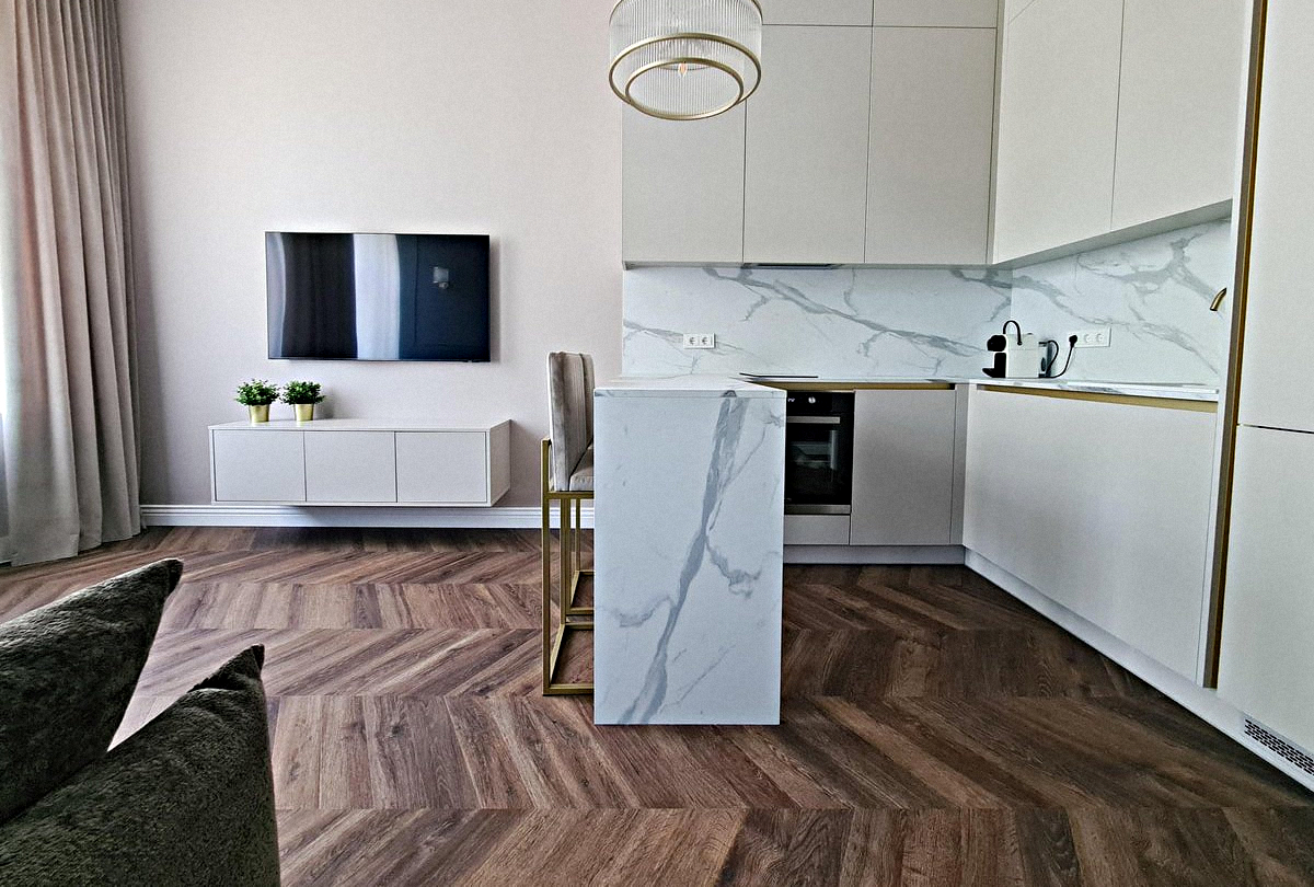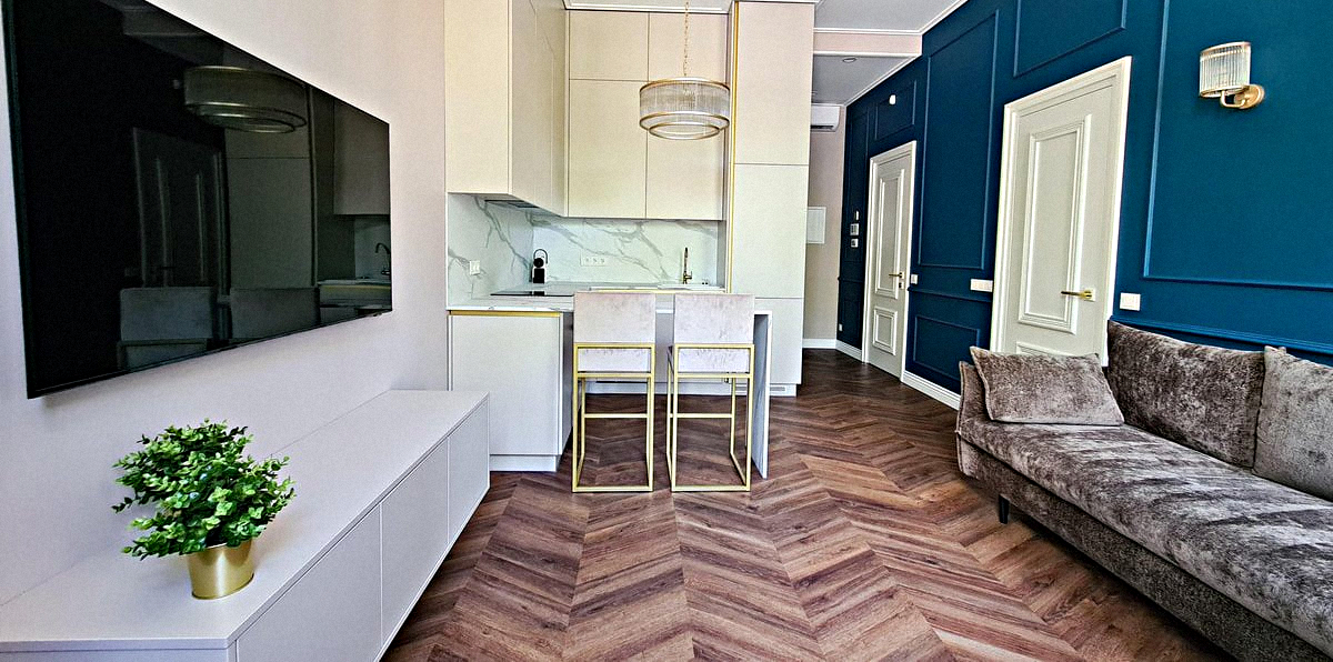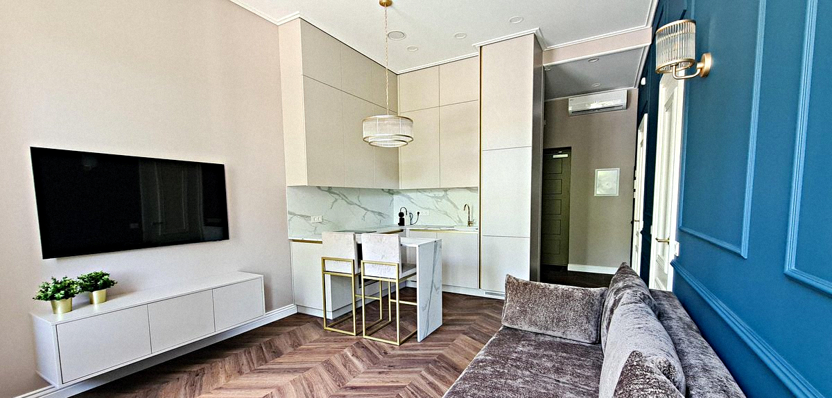 Shared kitchen combined with a living room: A sunny room with all necessary appliances, kitchen utensils, a small sofa, a dining table, a small sofa bed, and a Smart TV.