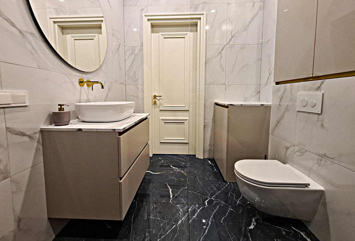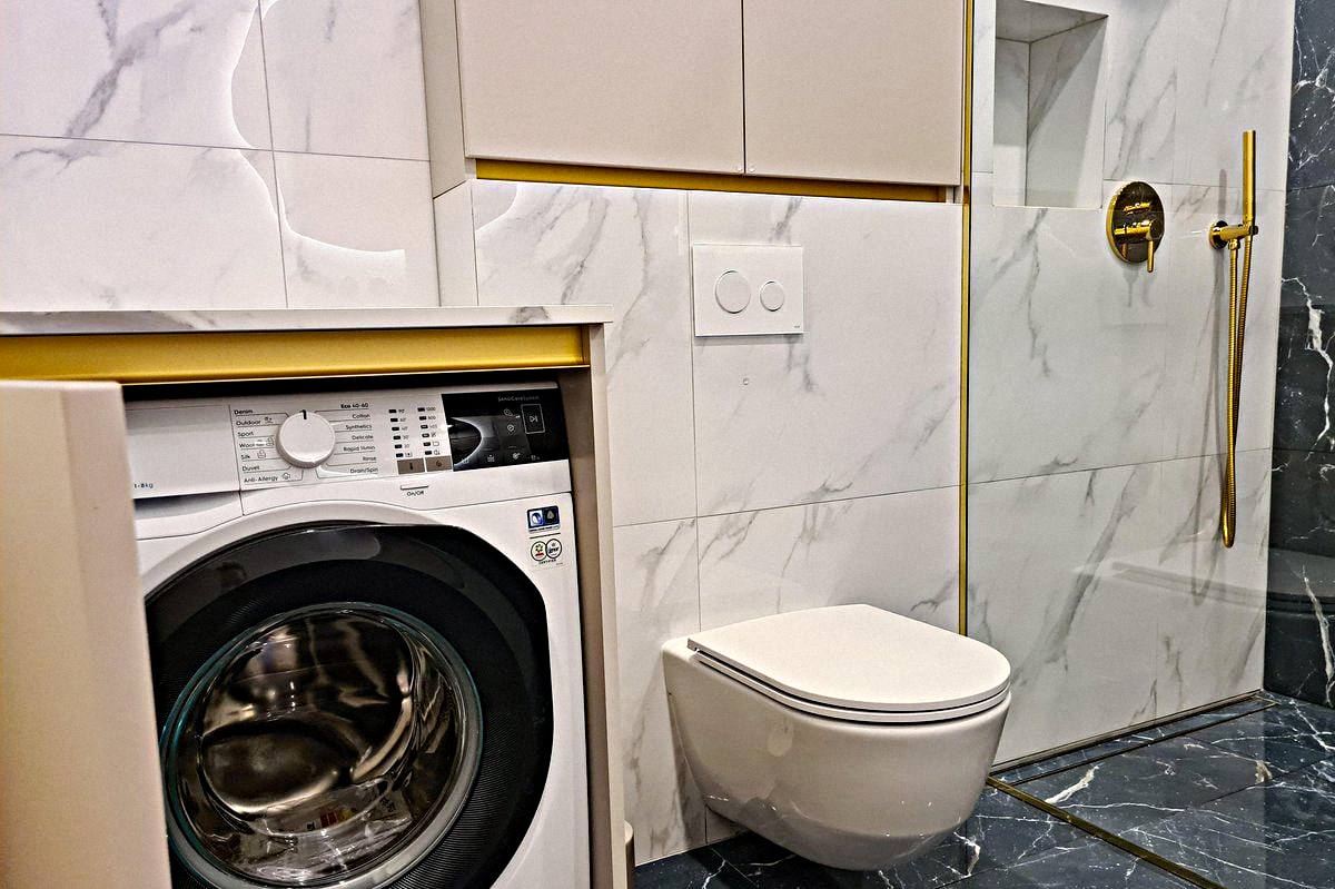 Shared bathroom: Equipped with a shower cabin, a sink with a mirror, a washing machine, and a toilet.