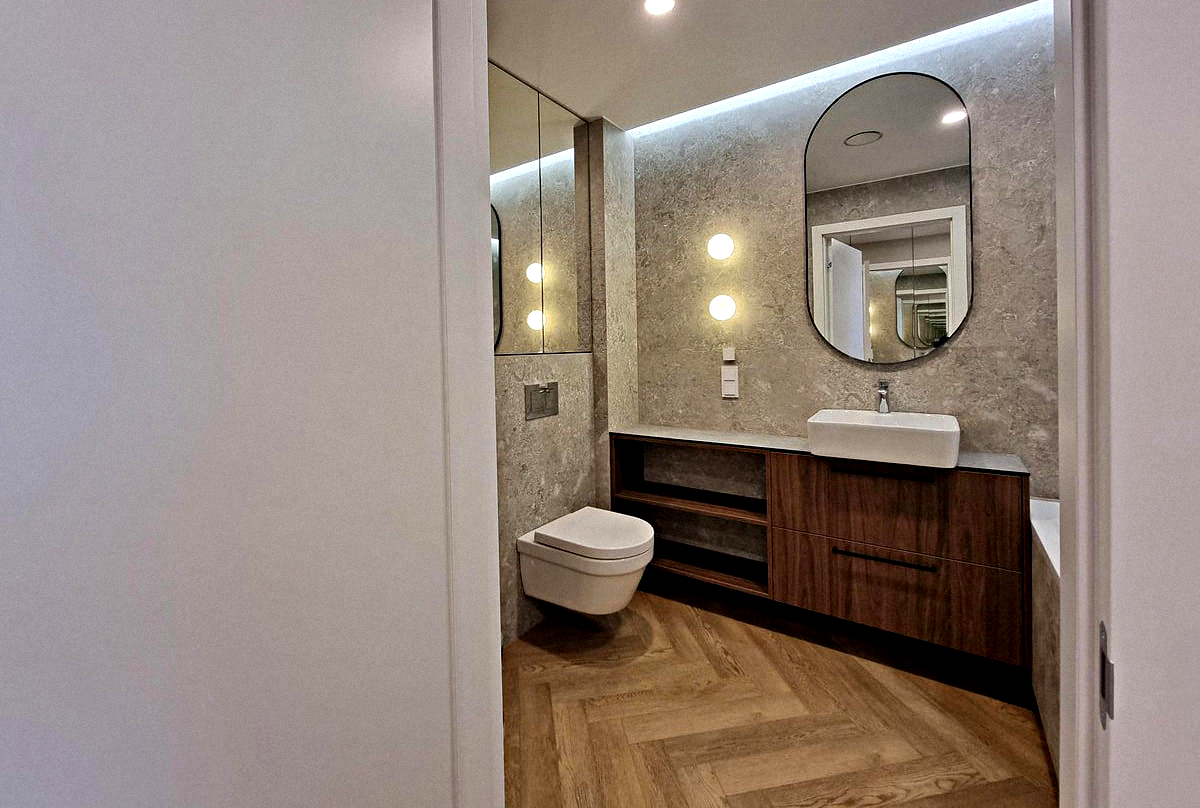 Bathroom: Bathtub, vanity unit with mirror, and toilet.