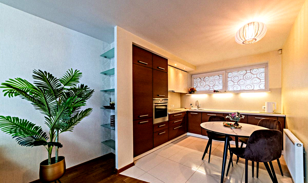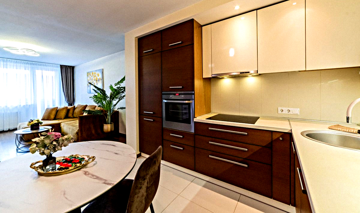 Shared kitchen combined with a living room: A sunny room with all necessary appliances, kitchen utensils, a dining table, a fold-out sofa, and a Smart TV.