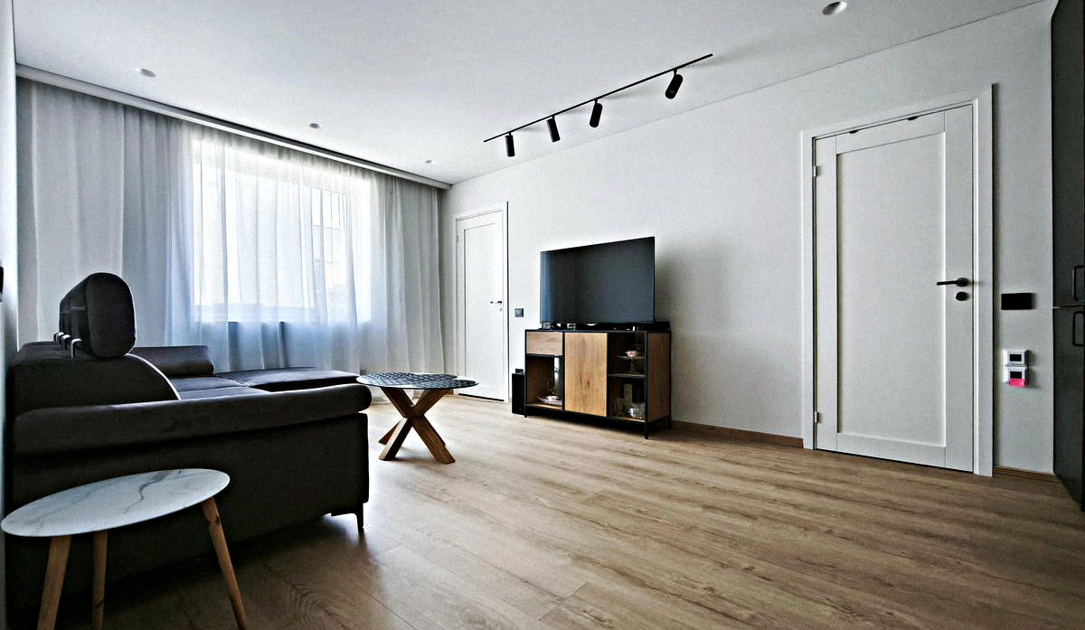Shared kitchen combined with living room: Sunny room with all necessary appliances, kitchen utensils, dining table, large fold-out sofa, and Smart TV.