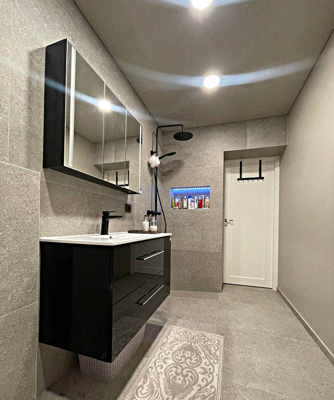 Shared Bathroom: Shower, sink with mirror, washing machine, and toilet.