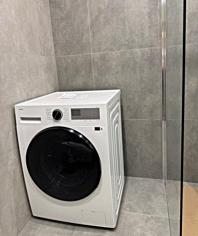 Bathroom: A shower stall, a sink with a mirror, a washing machine, and a toilet.