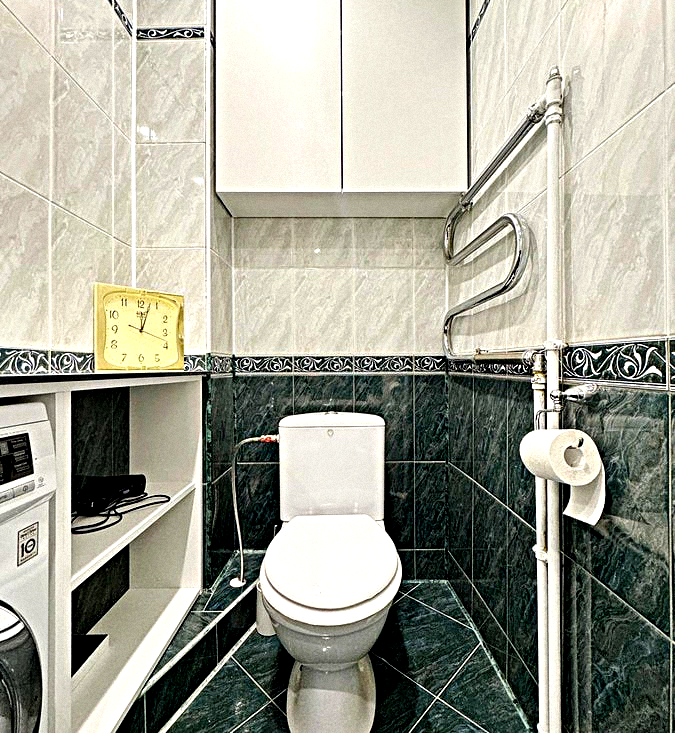 Shared bathroom: Equipped with a bathtub, sink with mirror, washing machine, and toilet.