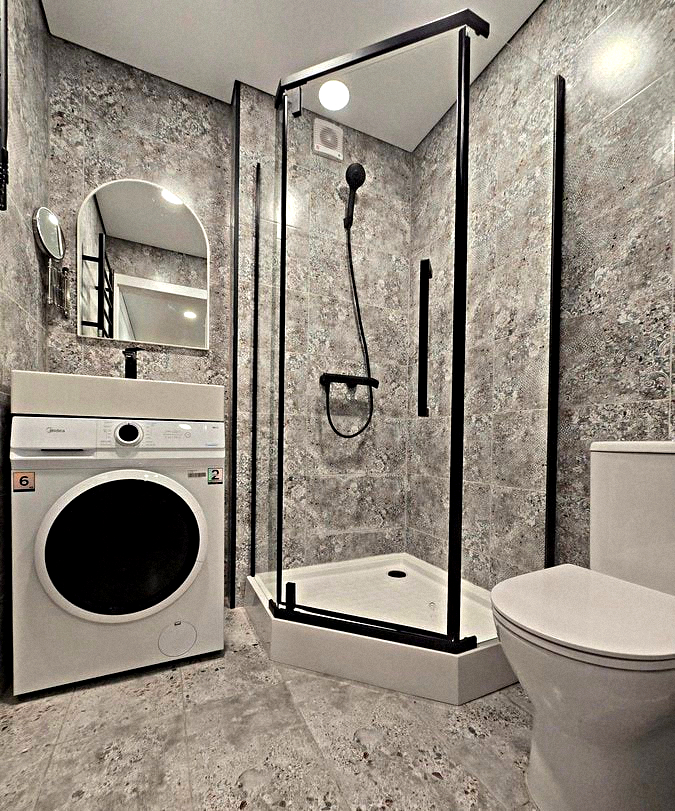 Bathroom: Shower stall, sink with mirror, washing machine, and toilet.