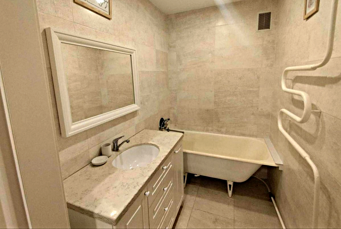 Shared bathroom: Equipped with a bathtub and a sink with a mirror.