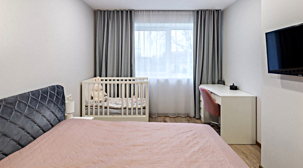 Bedroom: A comfortable room with a double bed, a crib, a wardrobe, a desk, air conditioning, and a Smart TV.