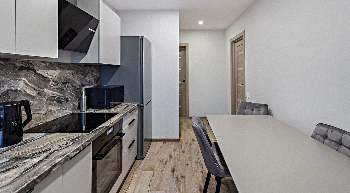 Shared Kitchen: A bright room with all necessary appliances, kitchen utensils, and a dining table.