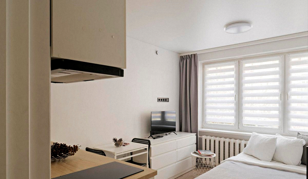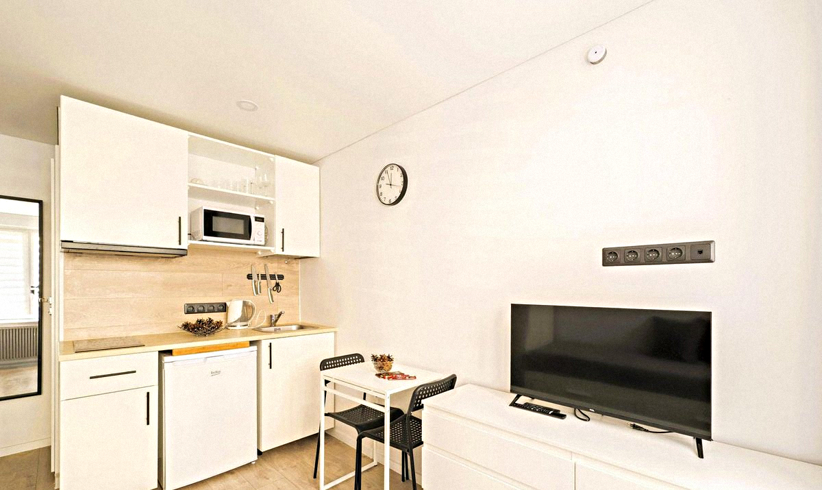 Kitchen-Bedroom: This sunny and bright room features all necessary appliances, kitchen utensils, a dining table, a wardrobe, a fold-out double bed, and a Smart TV.