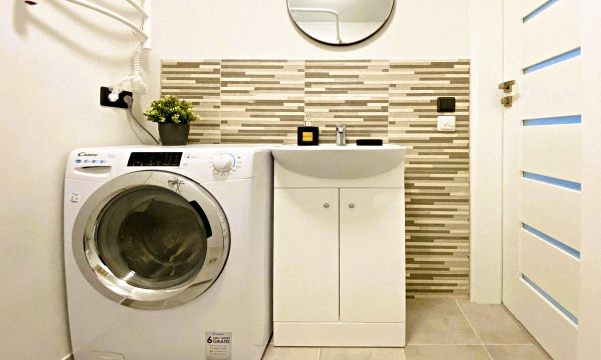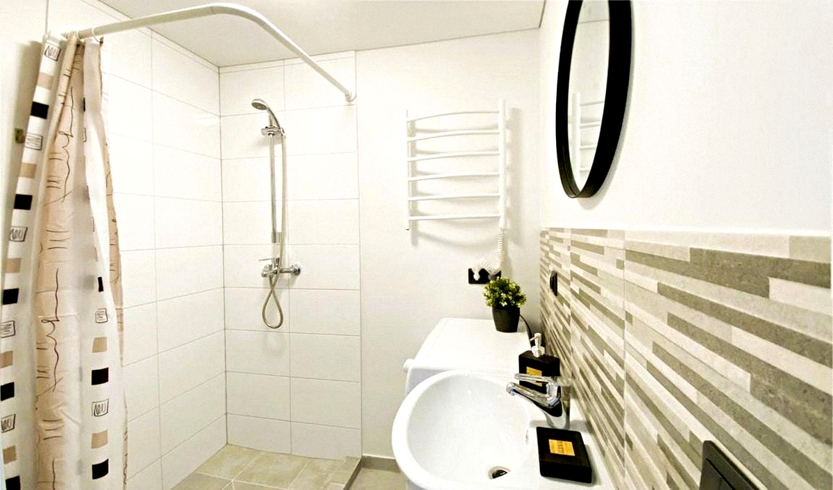 Bathroom: A shower, a sink with a mirror, a washing machine, and a toilet.