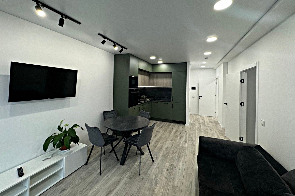 Kitchen/Living Room: Sunny room with all necessary appliances, kitchen utensils, dining table, small sofa, and Smart TV.