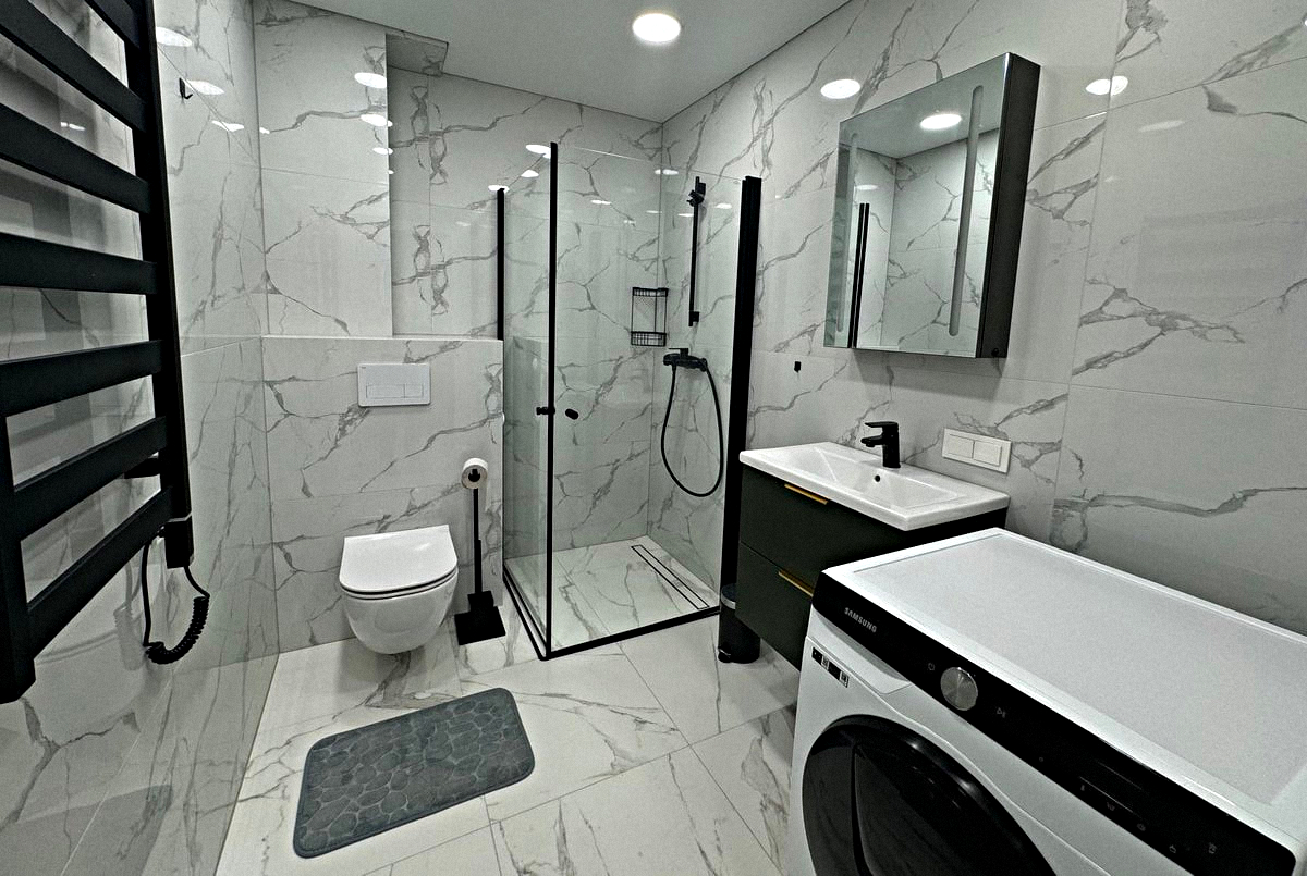 Bathroom: Shower stall, sink with mirror, washing machine, and toilet.