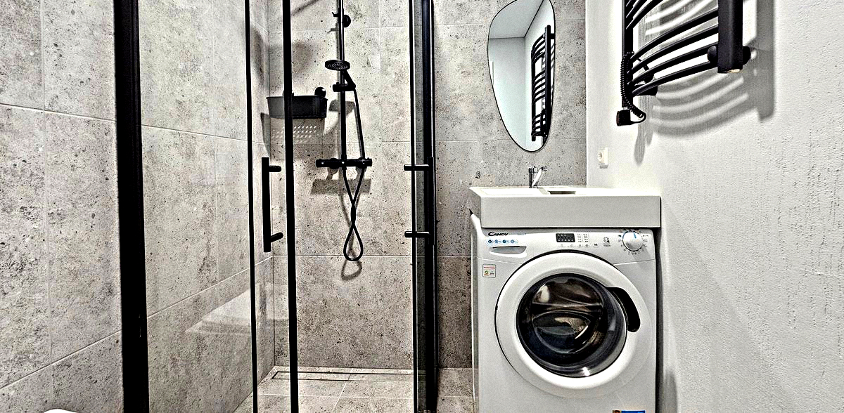 Bathroom: A shower stall, a sink with a mirror, a washing machine, and a toilet.