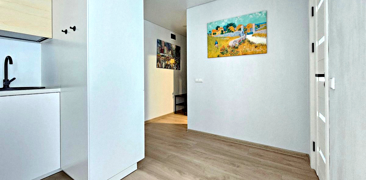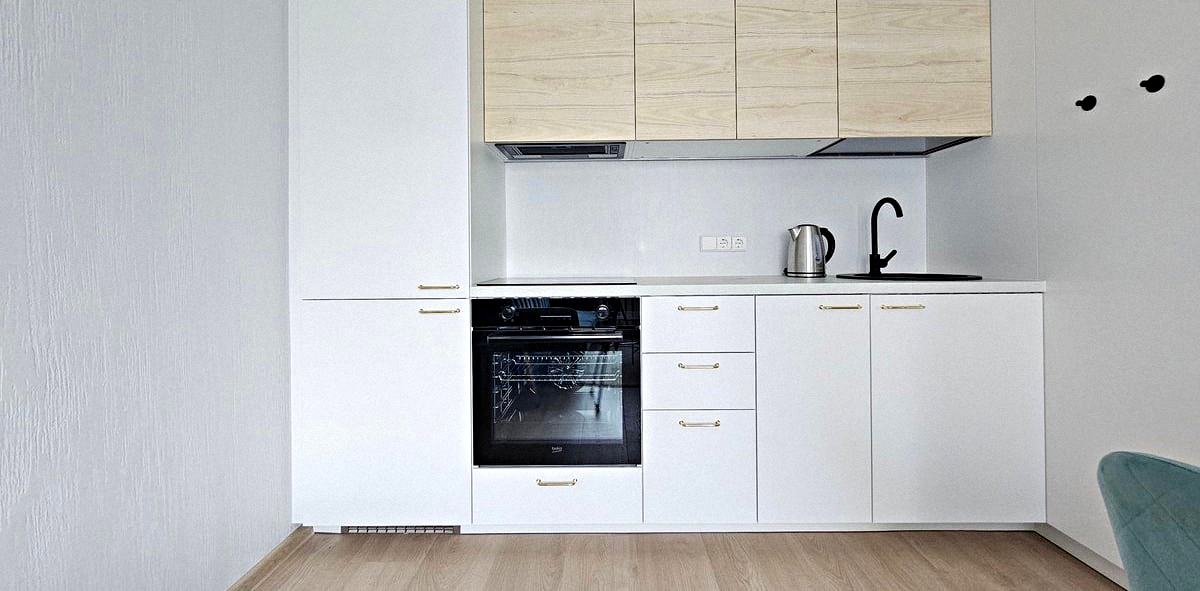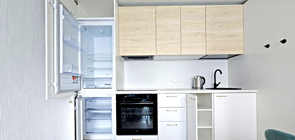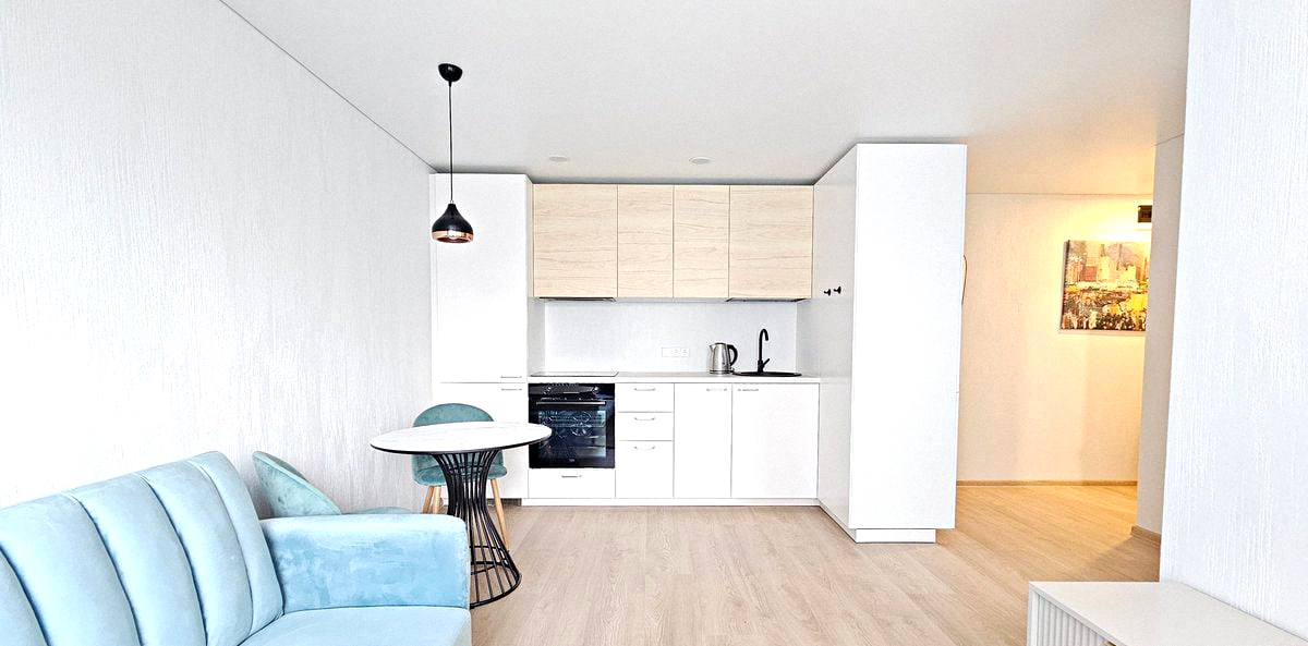 Living Room/Kitchen: A bright room with all necessary appliances, kitchen utensils, a dining table, and a fold-out sofa.
