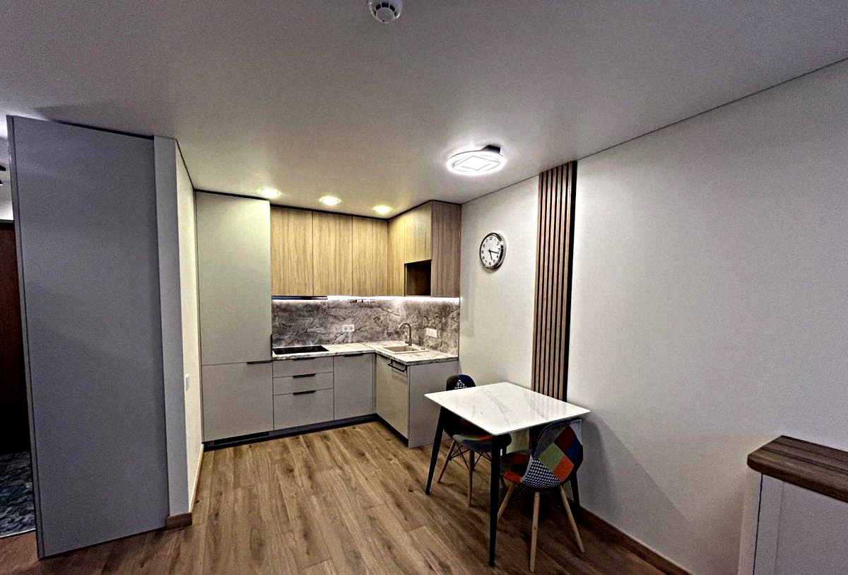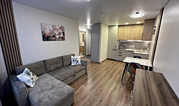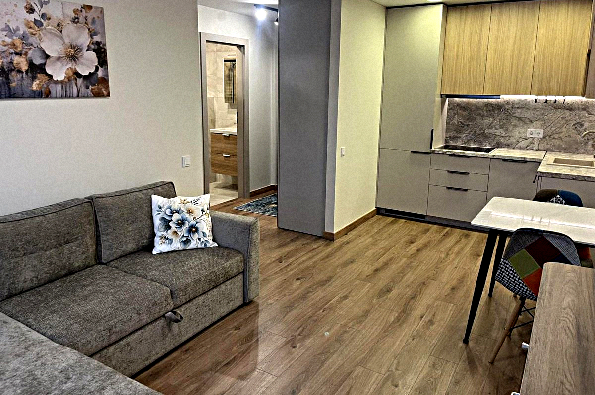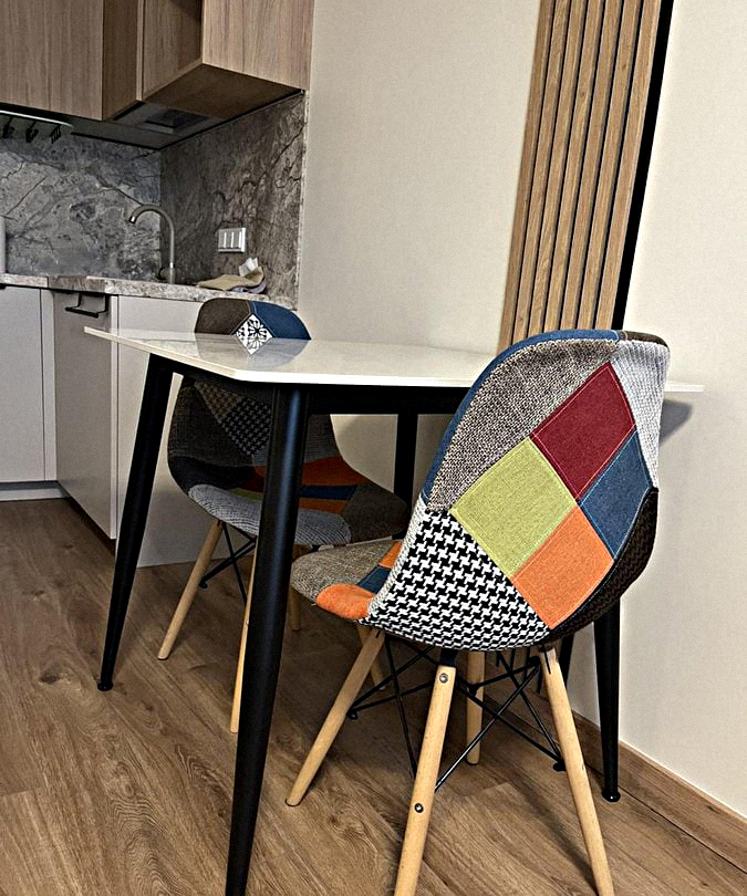 Kitchen/Living Room: Spacious room with all necessary appliances, kitchen utensils, a dining table, and a fold-out double bed.