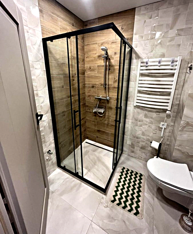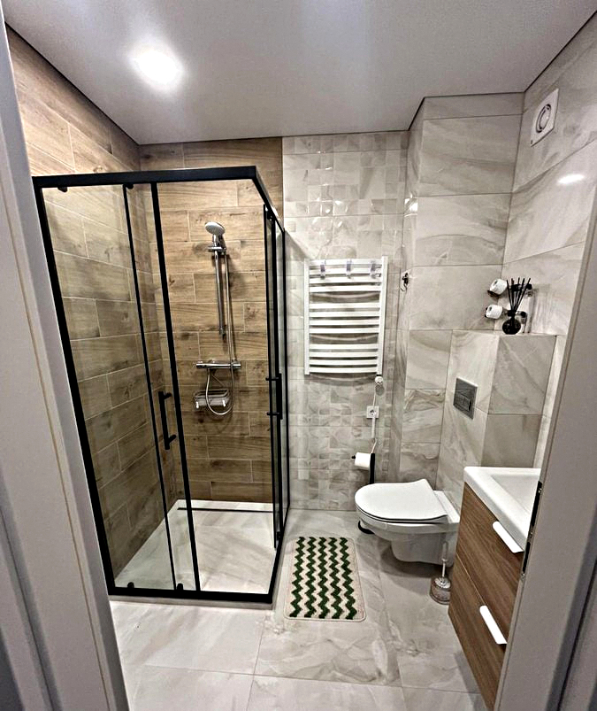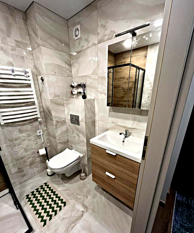 Bathroom: Shower, vanity unit with mirror, and toilet.