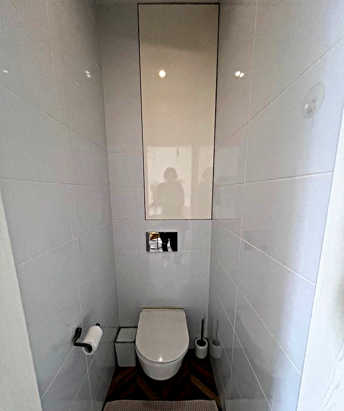 Shared bathroom: Equipped with a shower cabin, a sink with a mirror, and a washing machine.