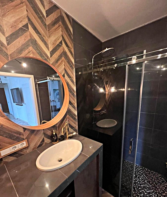 Shared bathroom: Equipped with a shower cabin, a sink with a mirror, and a washing machine.